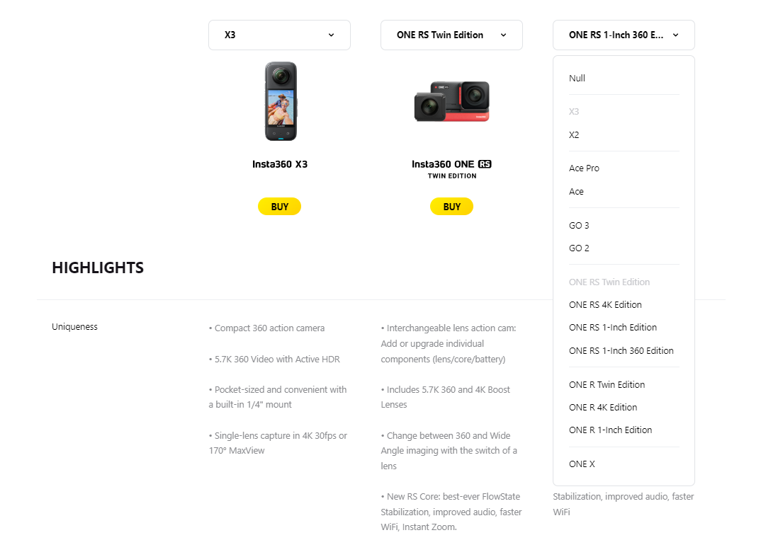 Please note that this page only supports comparisons for most consumer-grade cameras. Flow, Link, and our Pro series are not currently supported. If you would like to purchase the above-mentioned products, please directly view the product introductions on the official website, or contact customer service for more info.