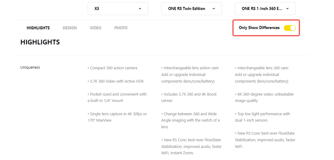 Note: For a concise comparison, select "Only Show Differences" at the top right to view only the distinctions between products.